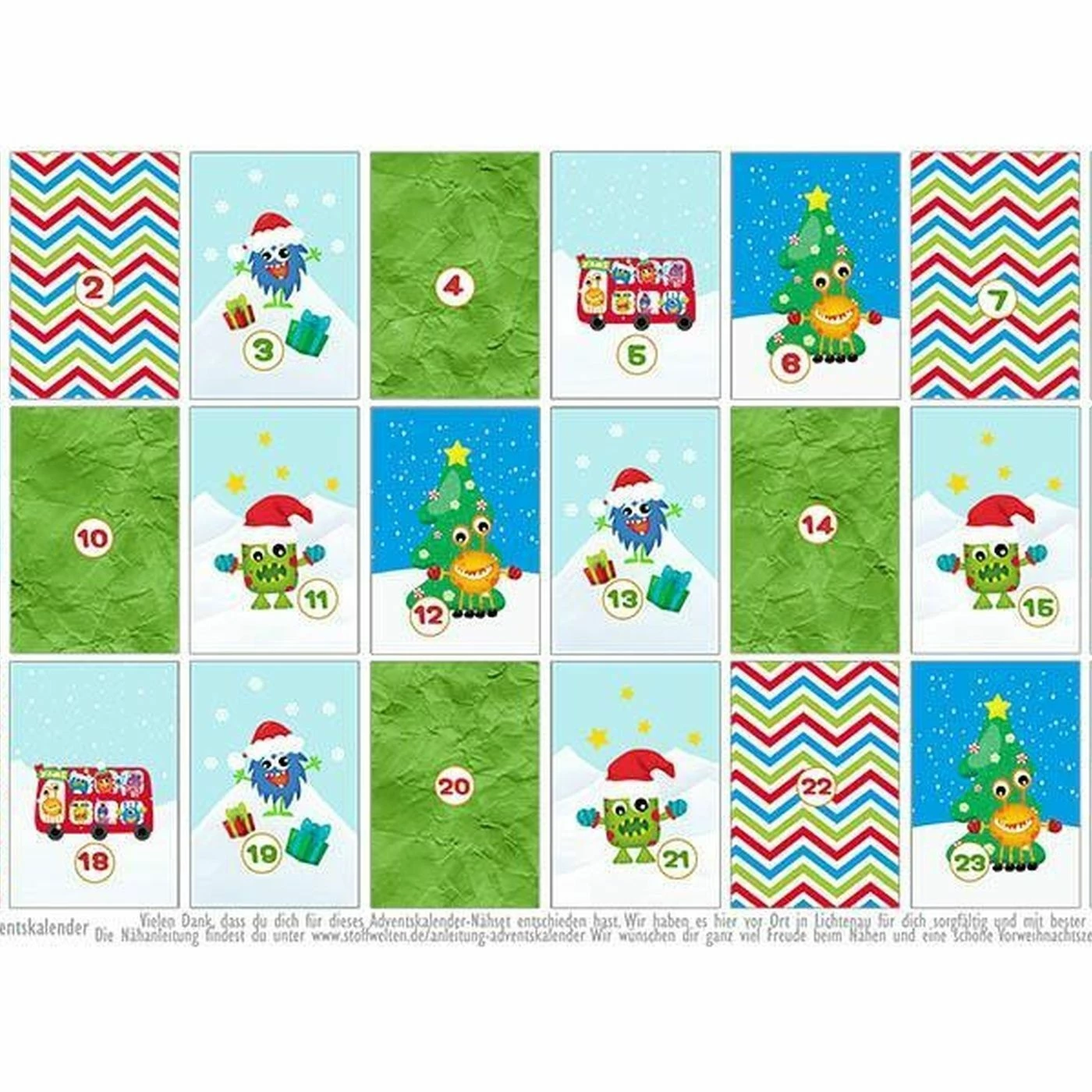 Hochwertiger Canvas, hier vor Ort mit BIO-Tinte in unserer wasserfreien Produktion gedruckt, in der ausschließlich erneuerbare Energie verwendet wird. Perfekt abgestimmt auf den im Artikel verlinkten Adventskalender. Wenn du ihn als Rückseite für den Adventskalender brauchst, benötigst du 80cm. Natürlich kannst du diese Meterware aus ganz losgelöst und eigenständig vernähen. 100% Baumwolle, ca. 136cm breit. Im nachhaltigen Druckverfahren produziert und natürlich Das erste Bild zeigt den Stoff als Muster, Bild 2 und 3 zeigen den Adventskalender, den es dazu zu kaufen gibt. Wir haben ihn extra verlinkt, zu dass du nicht lange suchen musst 😉