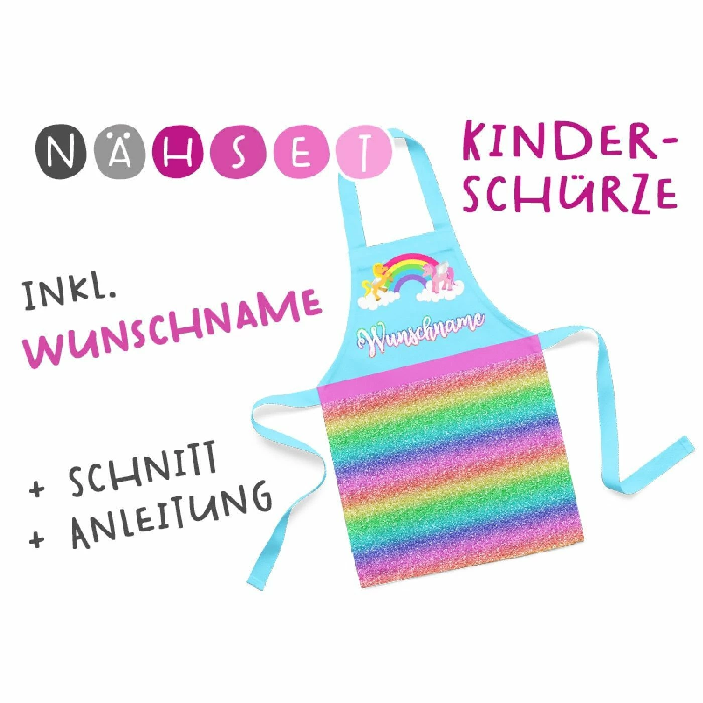 Nähset Kinder-Schürze Mit WUNSCHNAME, Regenbogen Pferde, Inkl. Schnittmuster + Anleitung