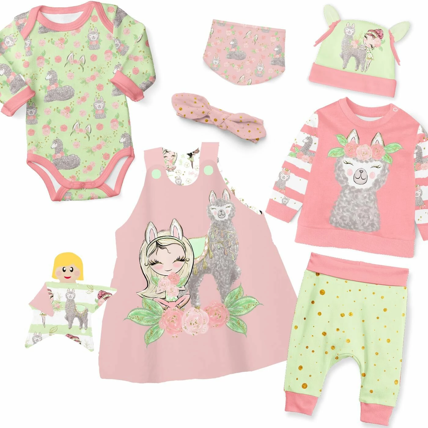 - Kleid, Pulli, Hose, Mütze, Halstuch, Schmusepuppe, Lätzchen und Body