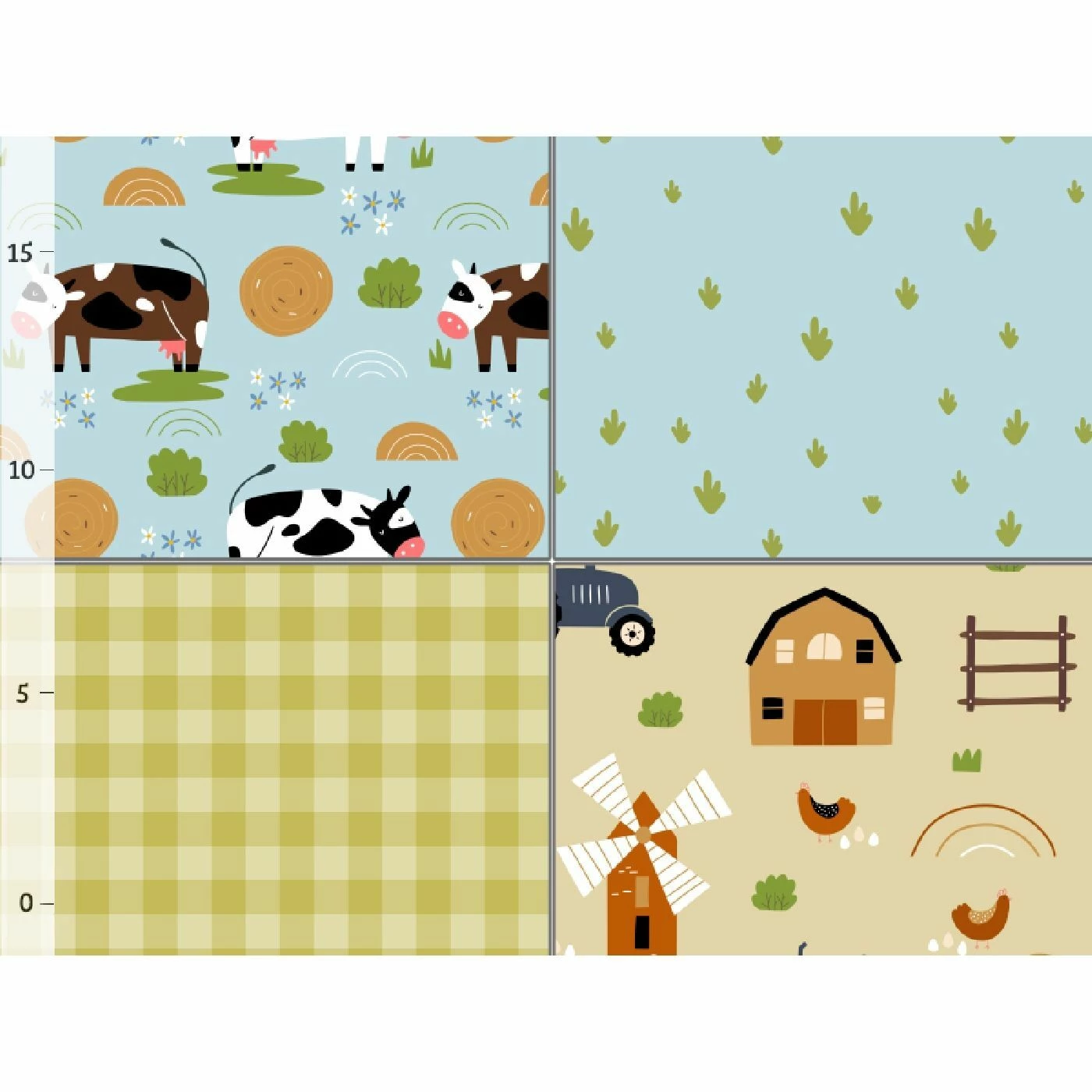 Auf voller Stoffbreite (ca. 149-150cm) bekommst du 110cm Stoff mit 6 verschiedenen Mustern, je ca. 50x55cm groß, minimale Abweichungen sind drucktechnisch bedingt. Zu diesem Patchworkpaket gibt es einen passenden uni, den wir dir direkt im Artikel als Kombistoff verlinkt haben.